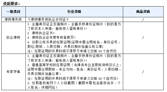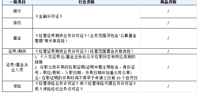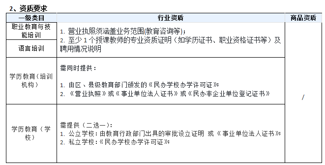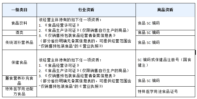 - 行业资质:是指商家经营该行业必须拥有的资质内容,如食品经营许可证、食品生产许可证等。