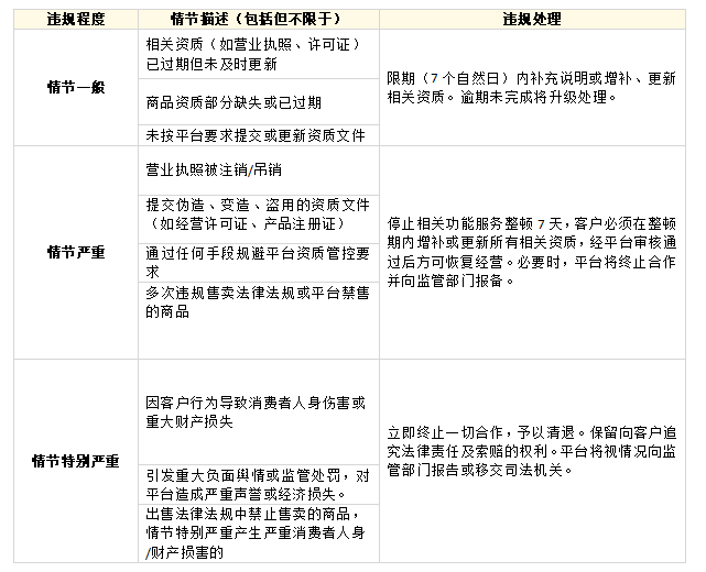 为保障平台合规运营与消费者权益,平台将根据以下规定对入驻客户的违规行为进行处理。本规定所列举的情节及处理措施包括但不限于以下内容,平台有权根据违规事实的性质、严重程度、影响范围及客户整改态度等进行综合判断,并采取相应措施,包括但不限于警告、限期整改、限制经营、终止合作等。