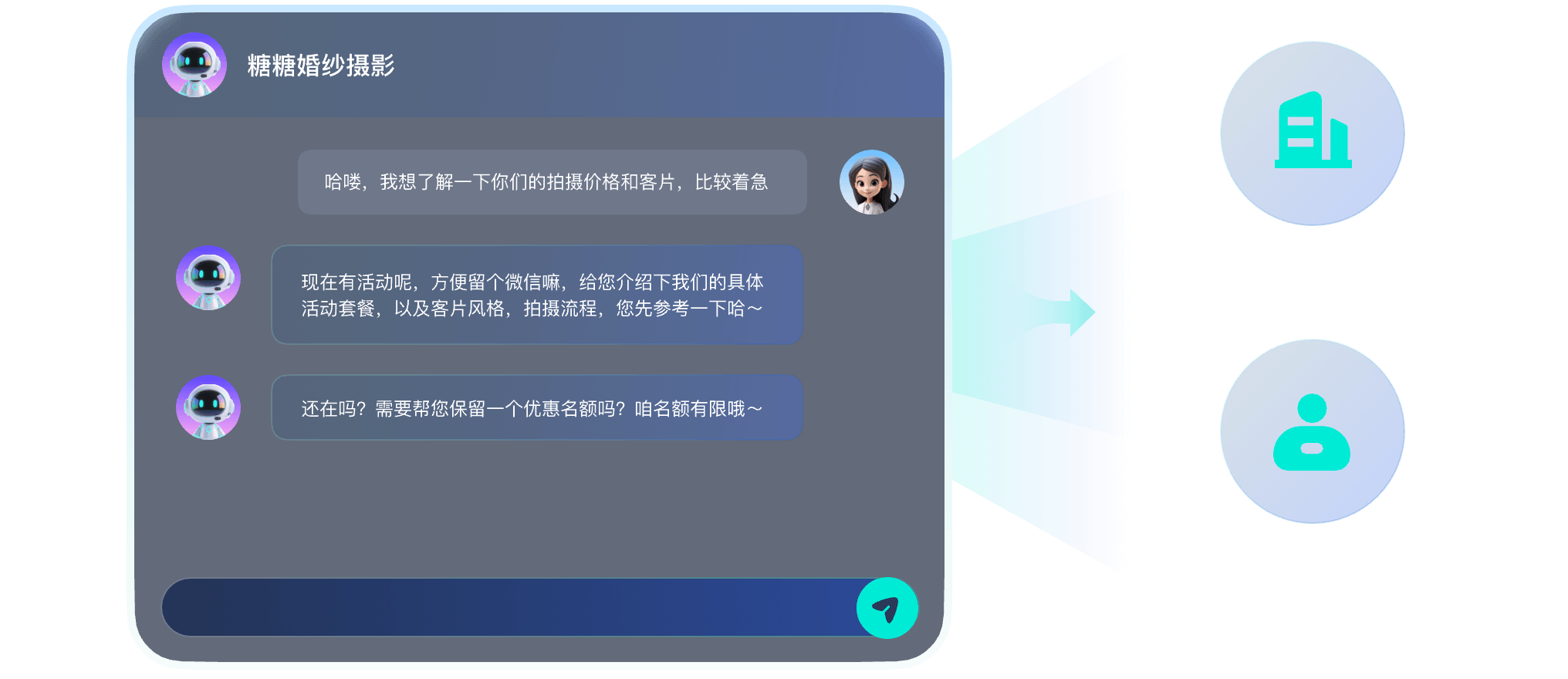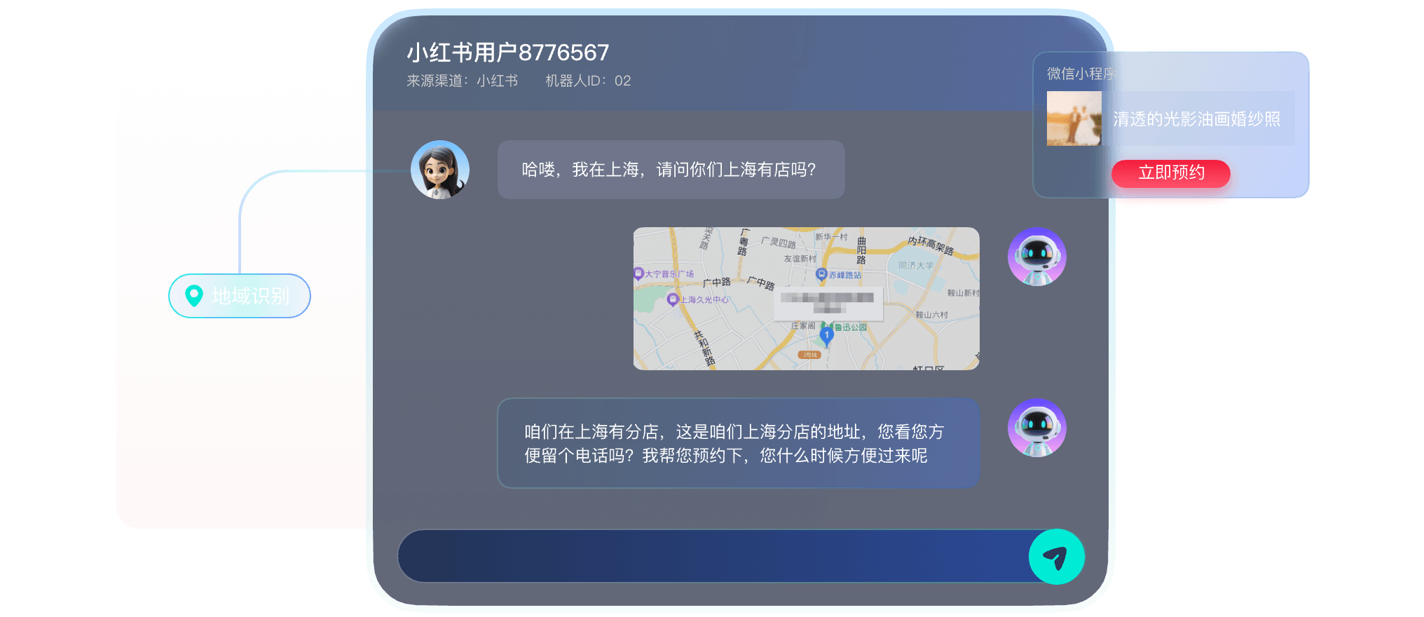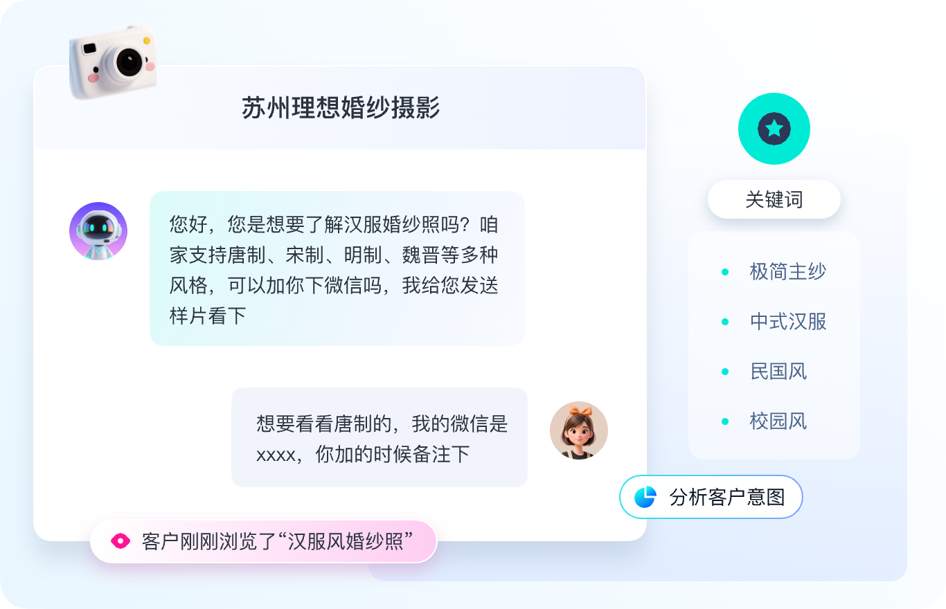 拟人多轮沟通,主动向客户推送门店位置信息、试拍卡、档期卡、优惠卡引导客户留资。