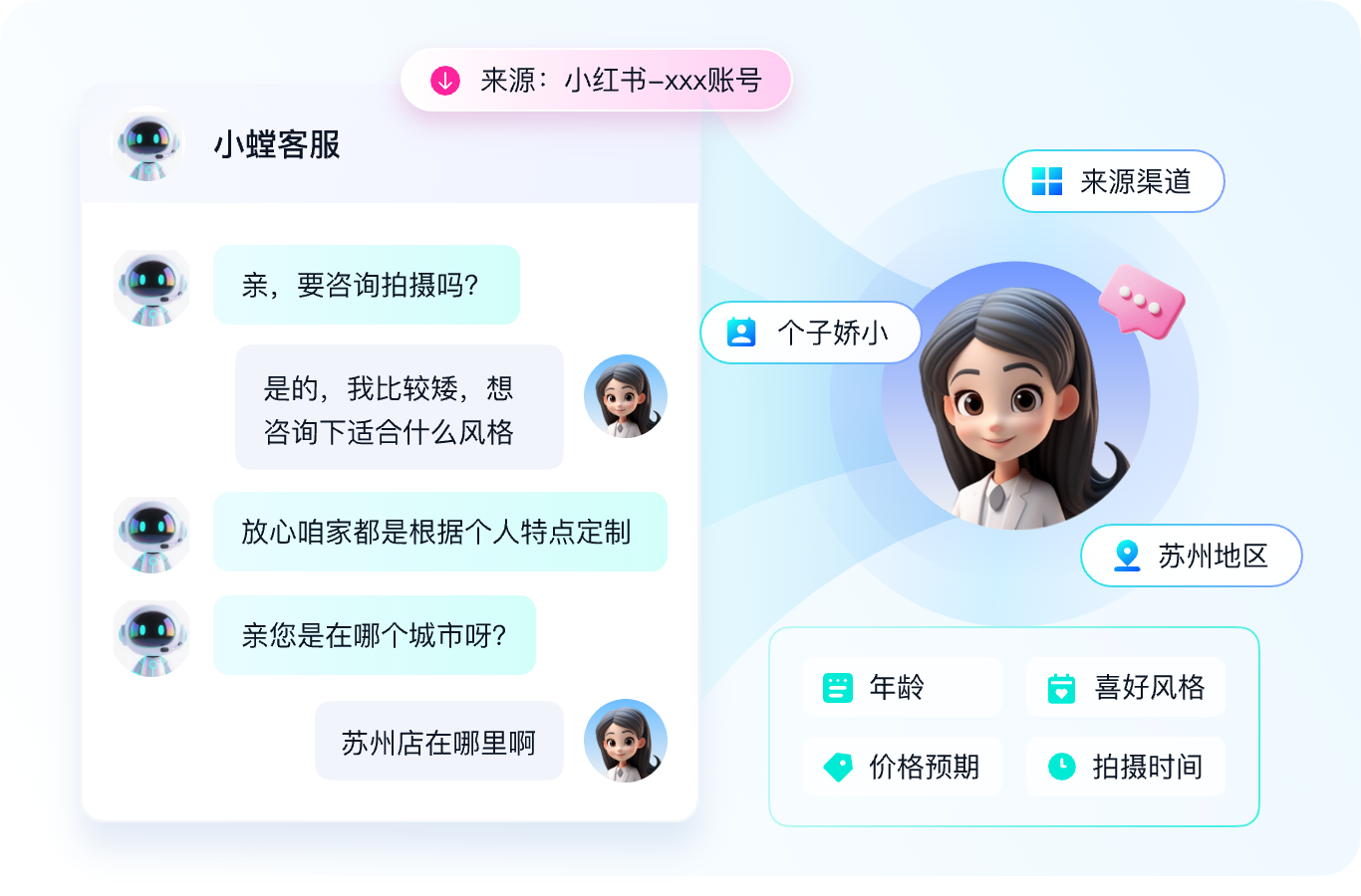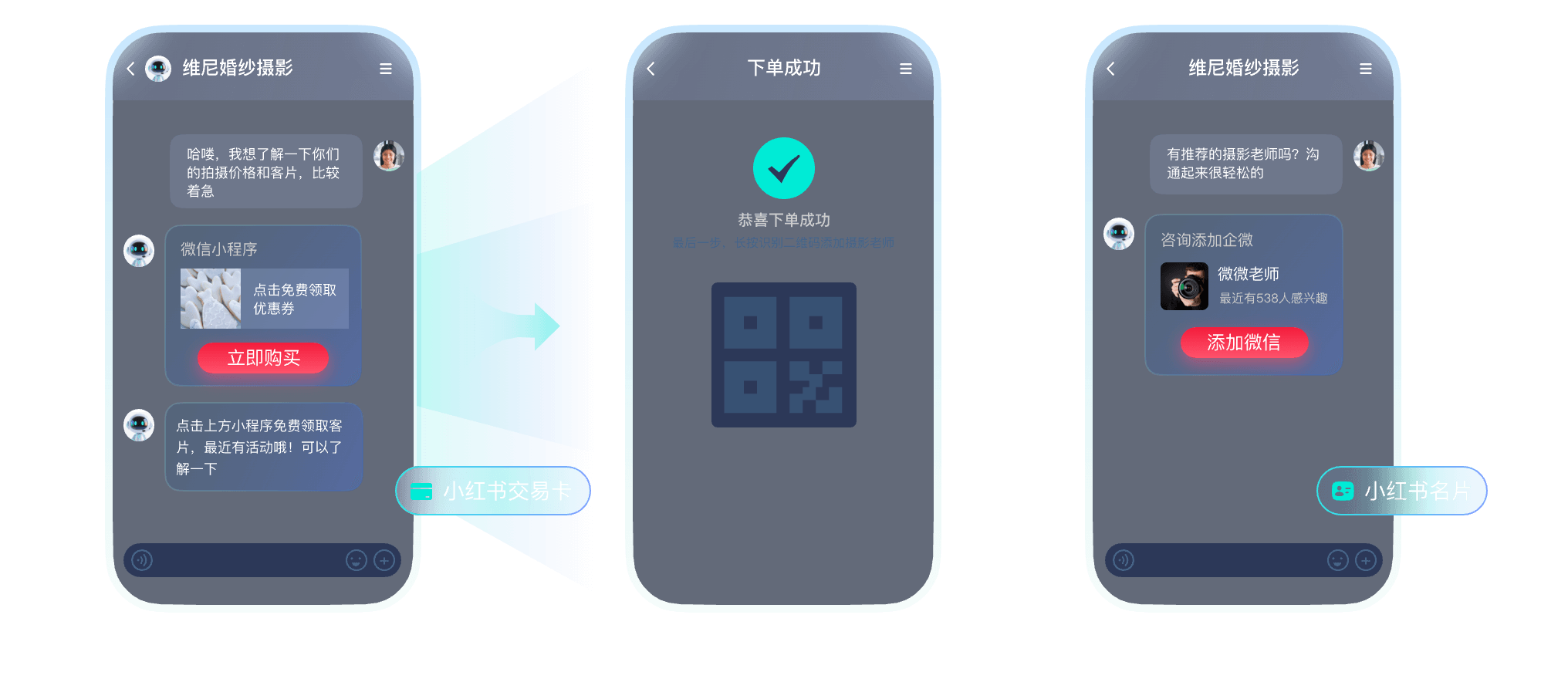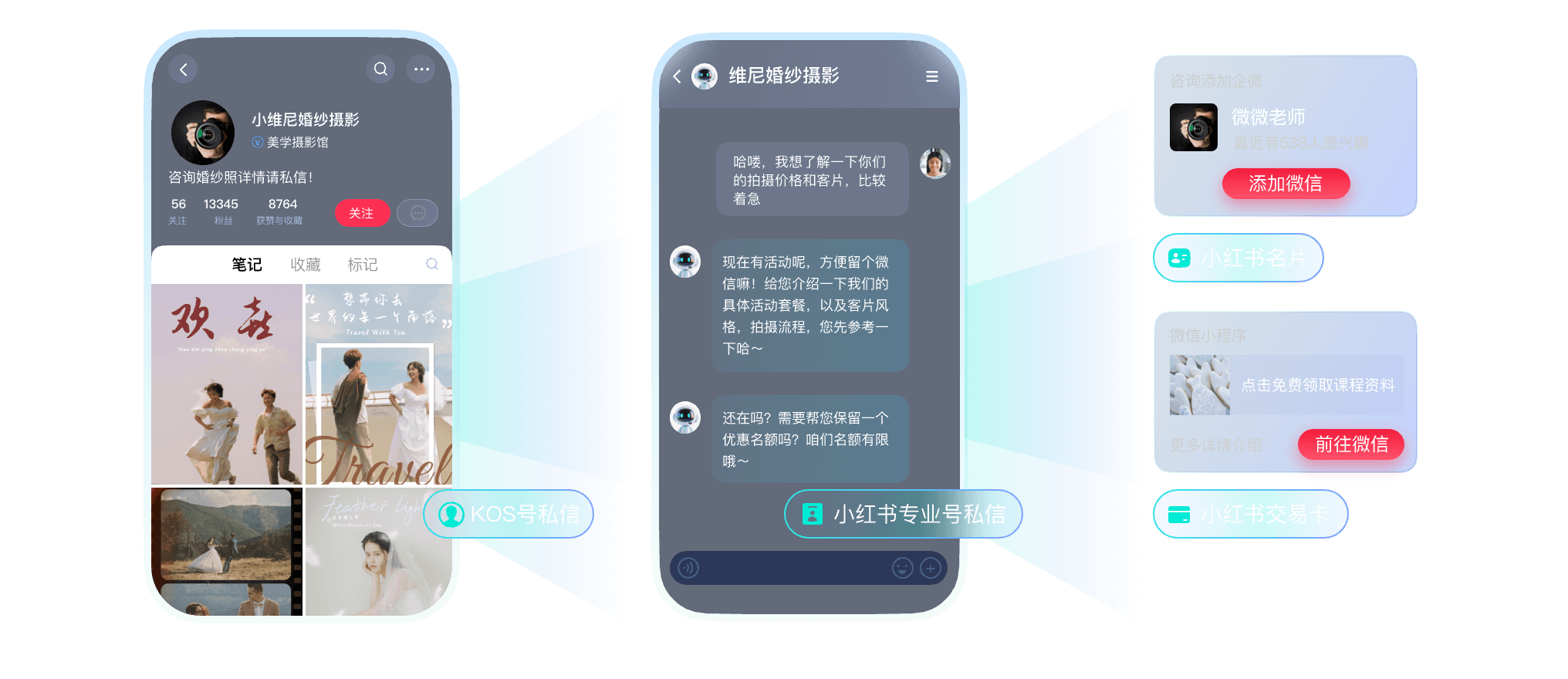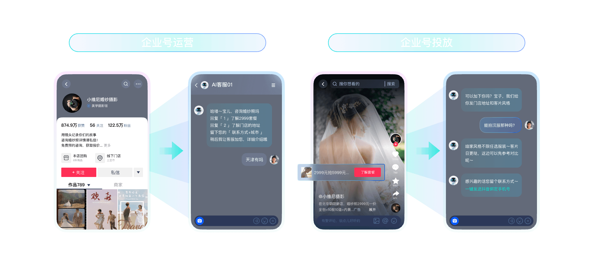 拟人多轮沟通,主动向客户推送门店位置信息、试拍卡、档期卡、优惠卡引导客户留资。