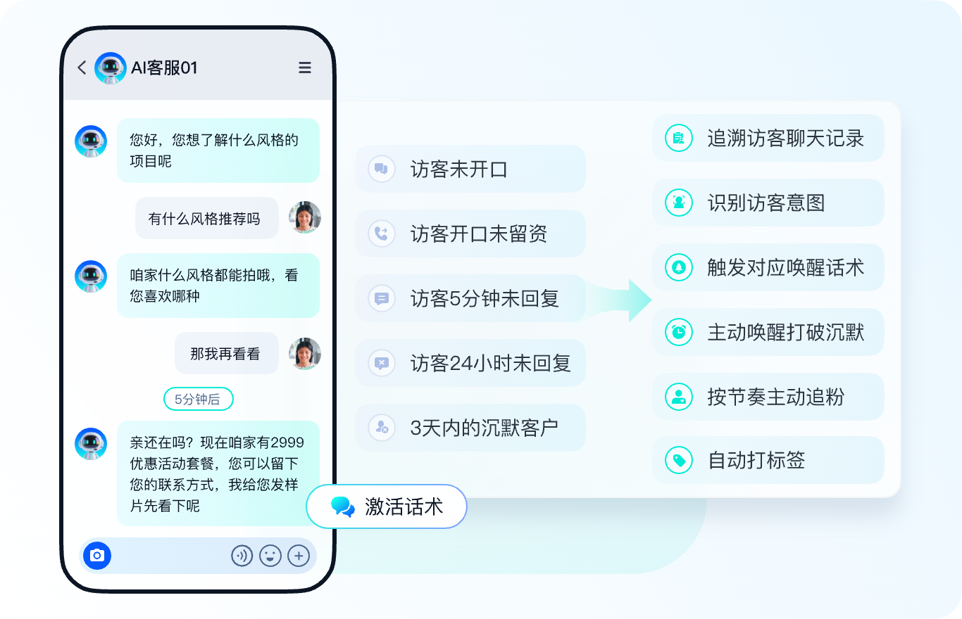 20w+专业话术库,智能学习与纠错,持续优化应答能力 智能识别客资,自动保存聊天过程中出现的手机号、微信号等。