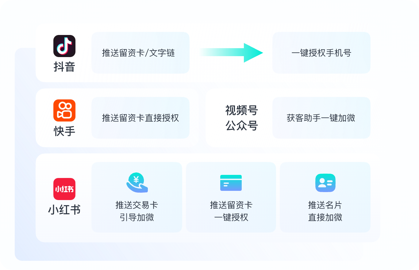支持推送抖音高级预约卡片、授权表单、抖音文字链接一键留资,提升客户留资转化率30%+